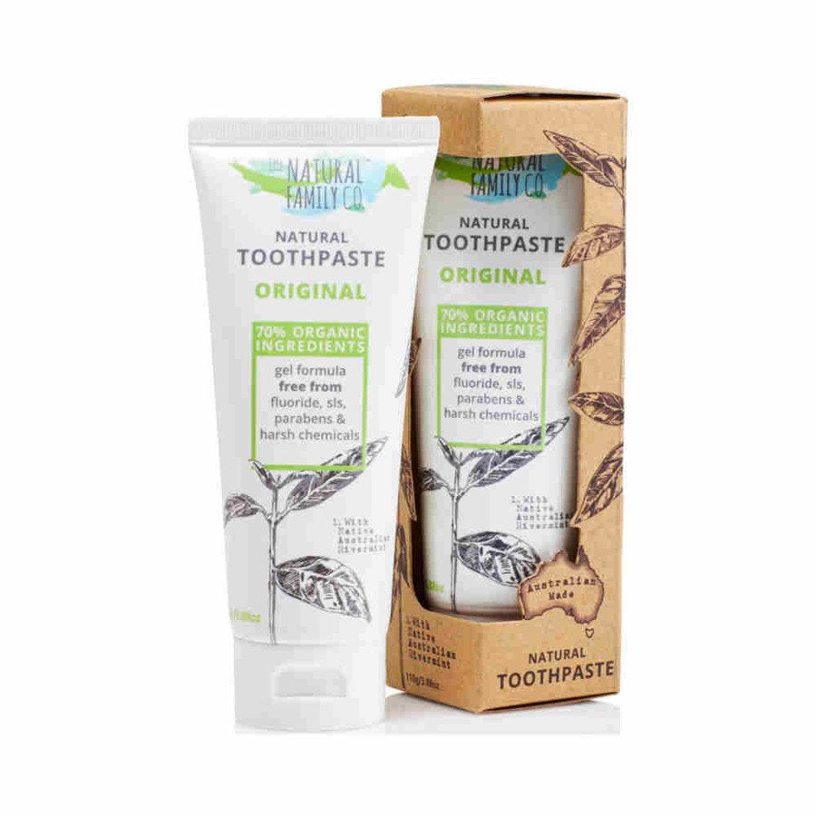 Natural Family Co, Naturalna pasta do zębów bez fluoru, Orginal, 110 g to produkt, który łączy w sobie moc naturalnych i organicznych składników. Dzięki swojej hipoalergicznej i niepowtarzalnej formule, kompleksowo dba o dobrą kondycję jamy ustnej, w tym dziąseł i zębów. Głównym składnikiem aktywnym jest mięta australijska, zbierana w lasach deszczowych. Zapobiega powstawaniu podrażnień i aft.