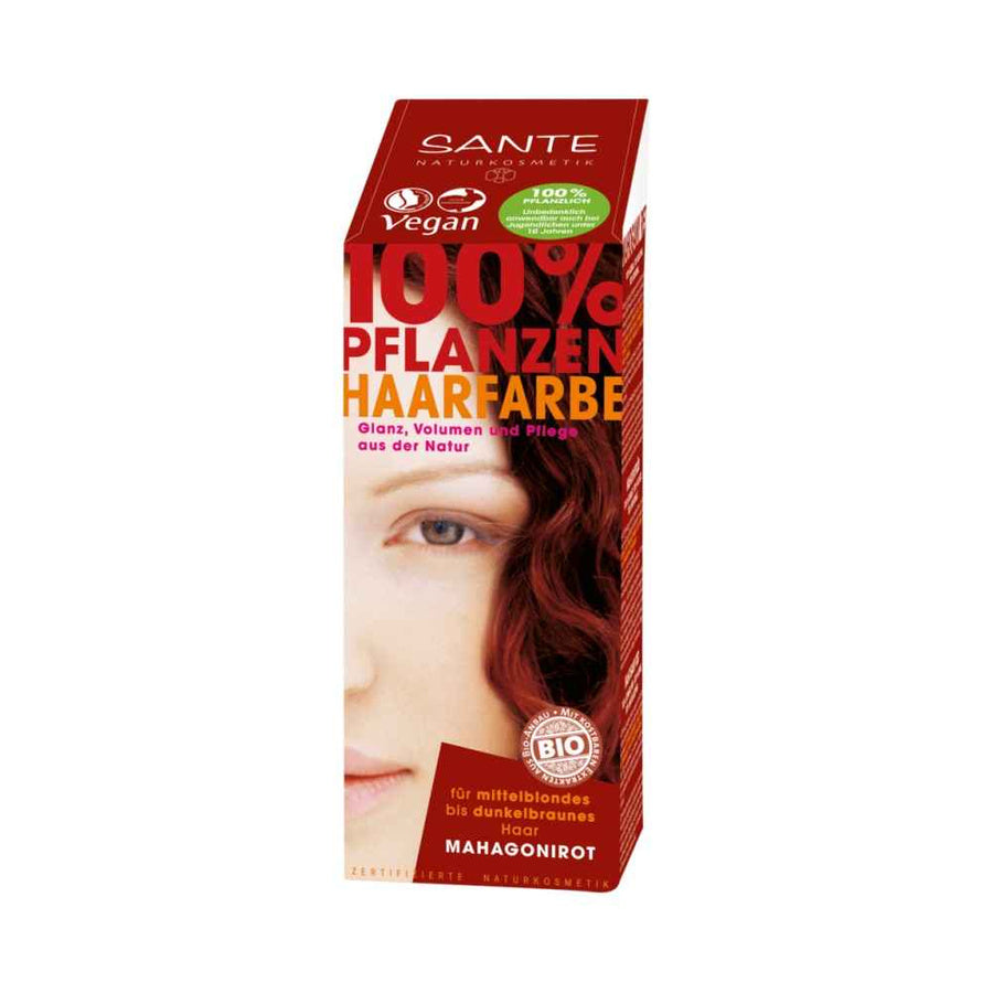 Roślinna farba do włosów od Sante nie zawiera utleniaczy, konserwantów, amoniaku ani innych składników chemicznych. Nie niszczy struktury włosa. Pozostawia je mocne i zdrowe, nawet po wielokrotnym farbowaniu.Teraz będziesz mogła cieszyć się bujną fryzurą, ponieważ zdrowe i lśniące włosy optycznie wyglądają na gęstsze i pełniejsze.Marka Sante Naturkosmetik gwarantuje wysoką jakość i naturalność składników użytych do produkcji roślinnych farb do włosów. Potwierdzeniem tego jest certyfikat NATRUE, organizacji, która promuje kosmetyki naturalne i organiczne. Zatem możesz mieć pewność, że używasz bezpiecznej i ekologicznej farby roślinnej.Odcień mahoniowej czerwieni to doskonały wybór dla osób, które chcą odświeżyć swój wygląd i dodać mu nieco ekstrawagancji. Pamiętaj, że ostateczny efekt zależy od Twojego naturalnego koloru włosów, ich struktury, dotychczasowej pielęgnacji oraz czasu koloryzacji.Farby roślinne do włosów od Sante to 9 wyjątkowych odcieni, które można ze sobą łączyć dla uzyskania niepowtarzalnego efektu.Dzięki roślinnej farbie do włosów w odcieniu mahoniowej czerwieni od Sante możesz cieszyć się nie tylko pięknym kolorem, jedwabistym połyskiem, ale również zdrowymi włosami. Wybierz teraz Naturalną farbę do włosów od Sante i poznaj siłę roślinnej koloryzacji!Sposób użyciaAby użyć farby w proszku Sante Naturalna do włosów w mahoniowej czerwieni, wymieszaj ją z gorącą wodą, aż uzyskasz gęstą pastę. Nanieś na umyte, suche włosy i pozostaw na 30-60 minut. Następnie spłucz i ciesz się intensywnym kolorem!Skład INCILawsonia Inermis (Henna) Leaf Powder, Beta Vulgaris (Beet) Root Powder, Juglans Regia (Walnut) Shell Powder, Indigofera Tinctoria (Indigo) Leaf Powder, Indigofera Argentea (Indigo) Leaf Powder, Maltodextrin, Betaine Algin Ingredients: Henna Powder, Beetroot Powder, Walnut Shell Powder, Indigo Powder, Maltodextrin, Betaine, Alginate